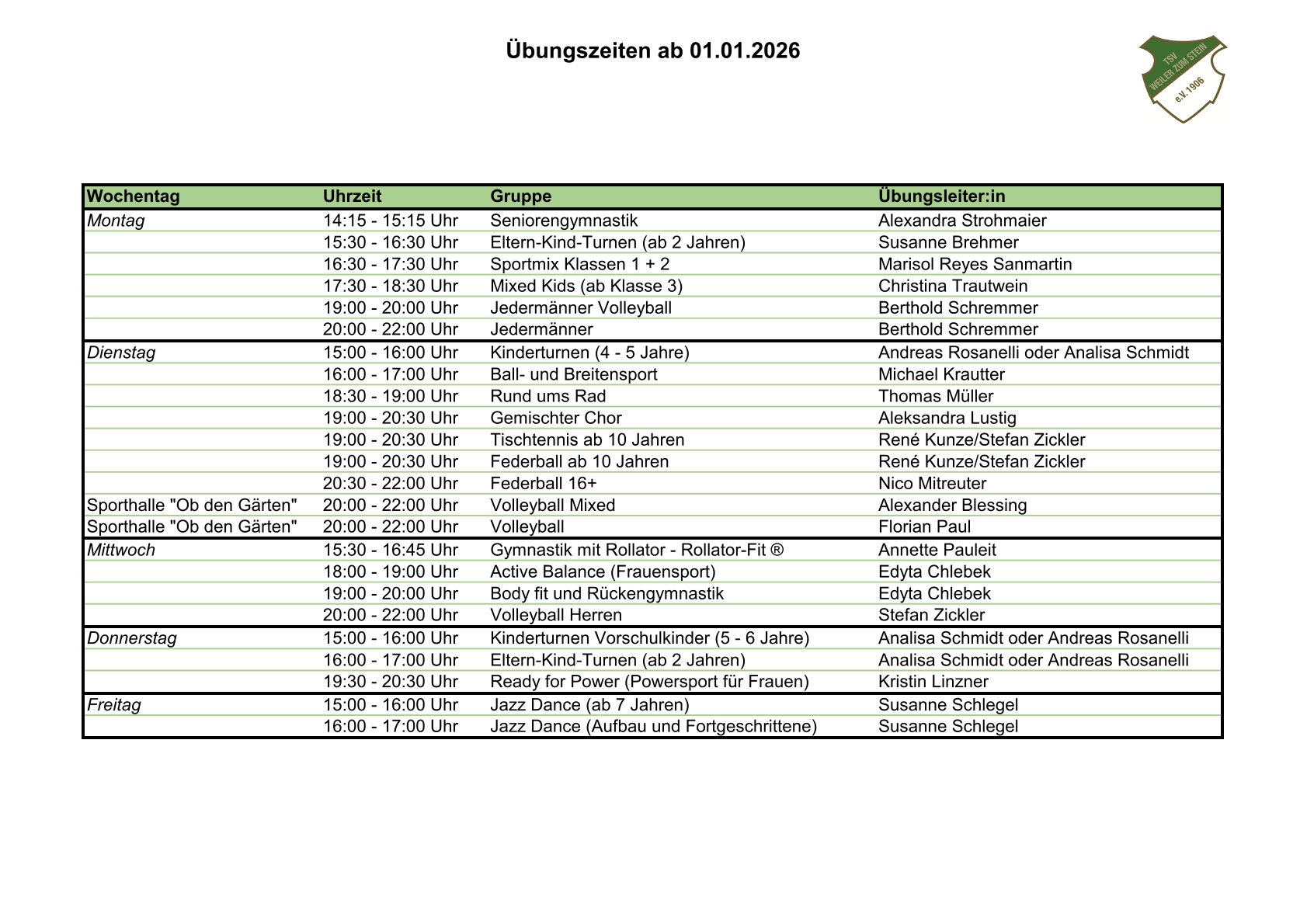 Übungszeiten ab 01.01.2026